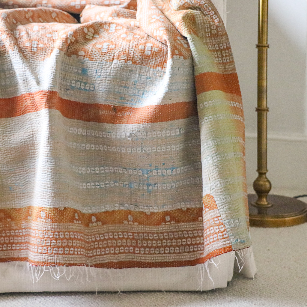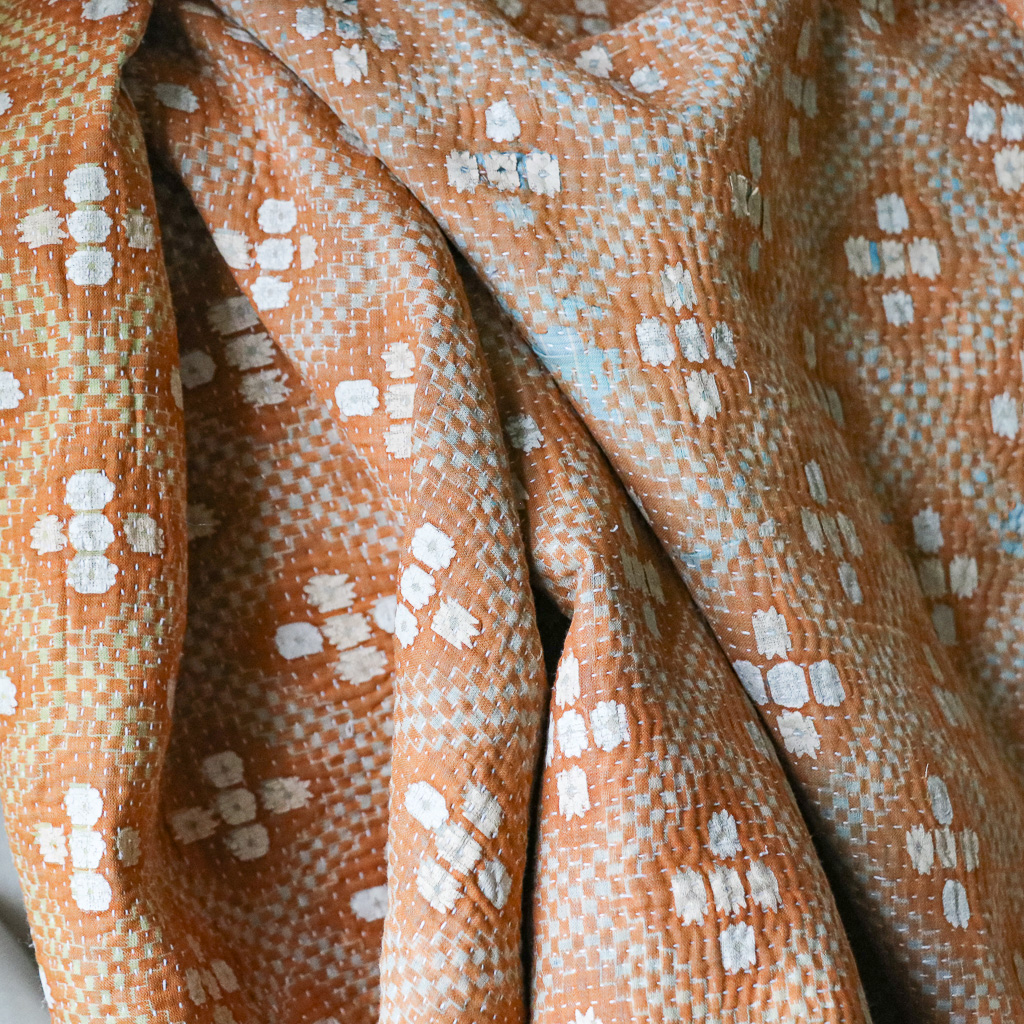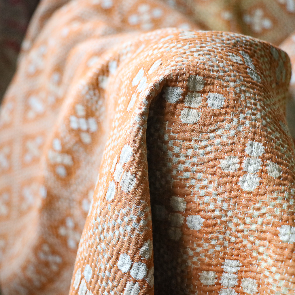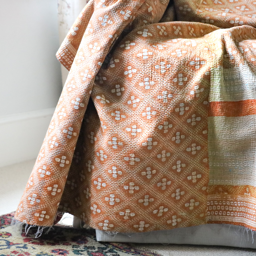 The Jules Kantha is one supreme find. Honey Mustardy brown with white offset pattern throughout, this lovely is wonderfully versatile. Very subtle hints of delicate light blue and yellow shine reveal through the pattern up close but fade away from a short distance — adding to her charm. Jules’ colour way pairs perfectly with everything from your favourite antique walnut heirlooms to fresh contemporary pieces in oak or upholstery. The hue matches all our favourite neutrals to pinks and greens and, yes, even those certain shades of blues.