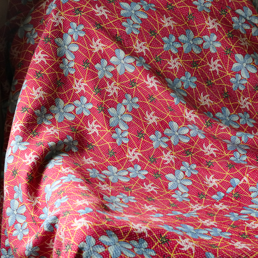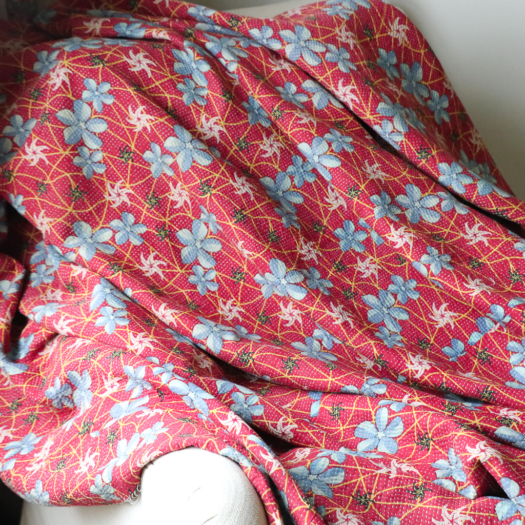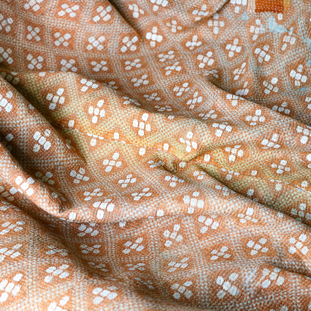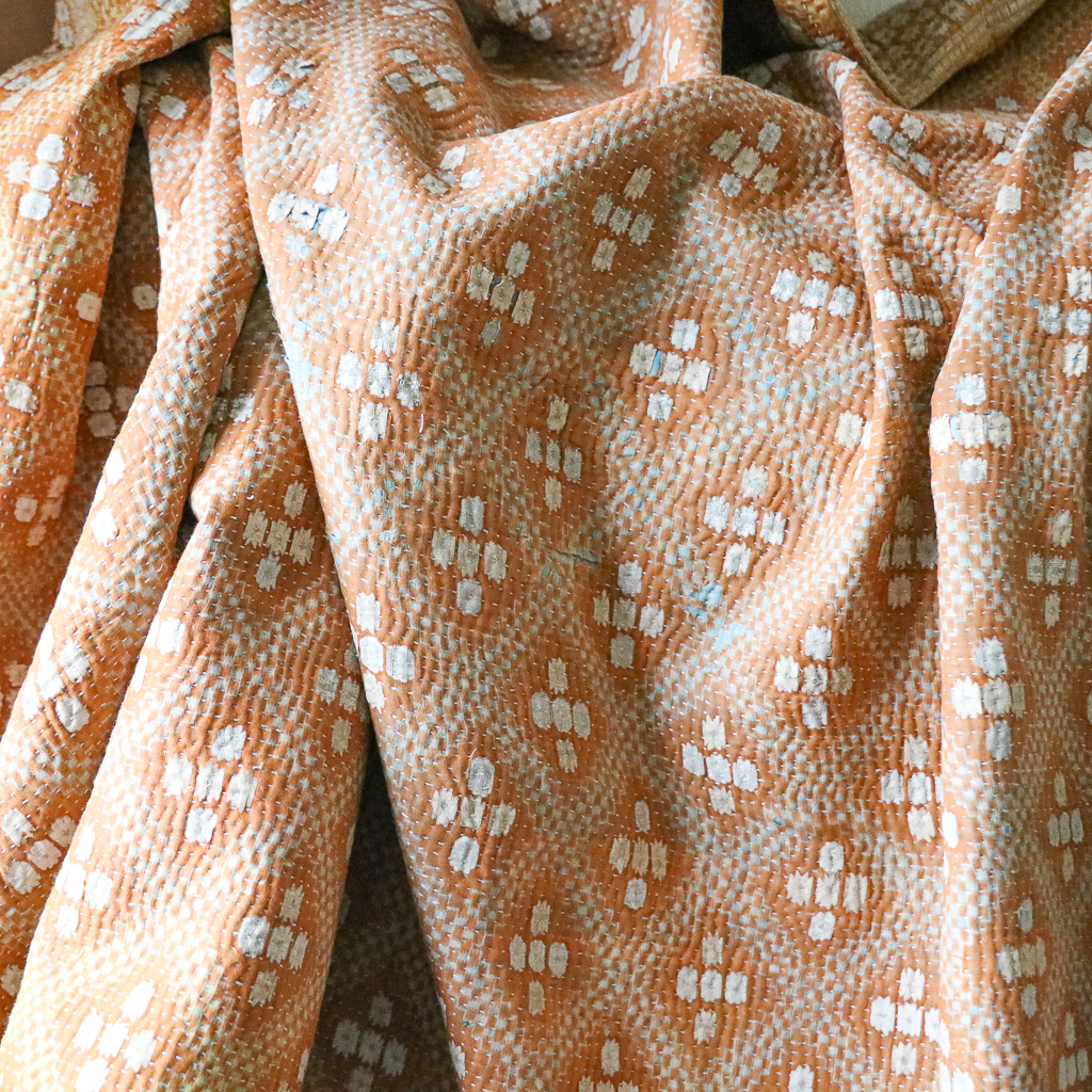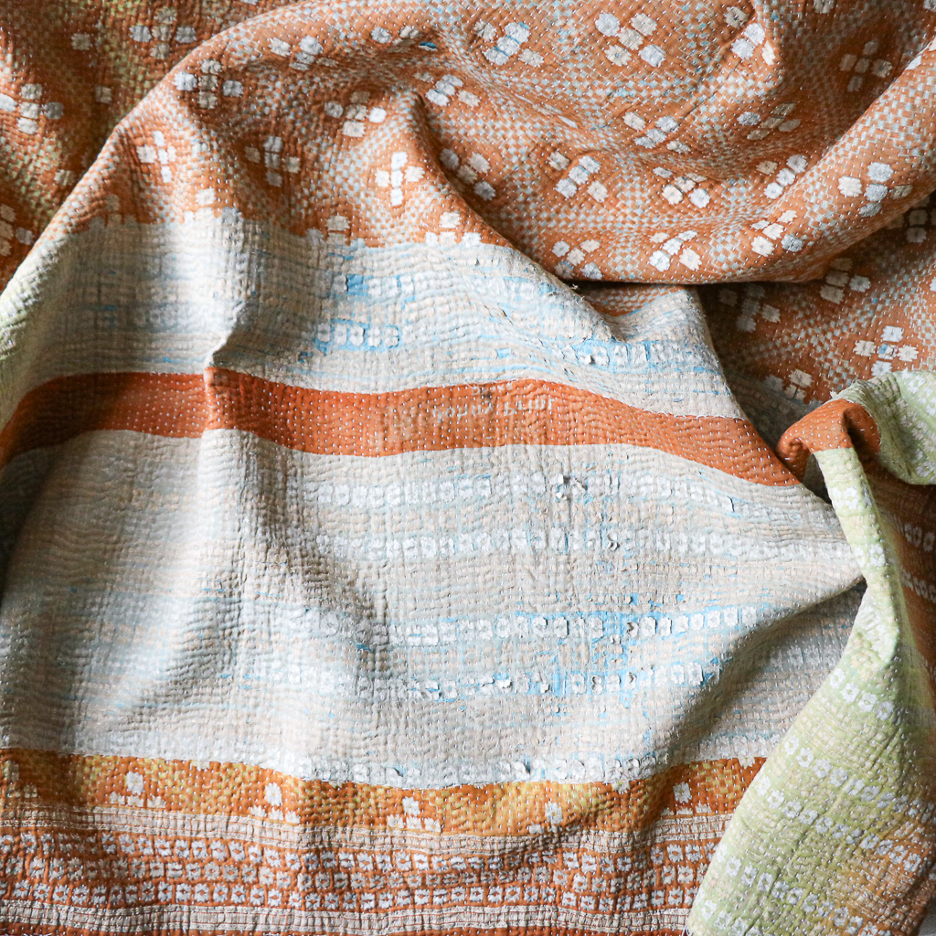The Jules Kantha is one supreme find. Honey Mustardy brown with white offset pattern throughout, this lovely is wonderfully versatile. Very subtle hints of delicate light blue and yellow shine reveal through the pattern up close but fade away from a short distance — adding to her charm. Jules’ colour way pairs perfectly with everything from your favourite antique walnut heirlooms to fresh contemporary pieces in oak or upholstery. The hue matches all our favourite neutrals to pinks and greens and, yes, even those certain shades of blues.