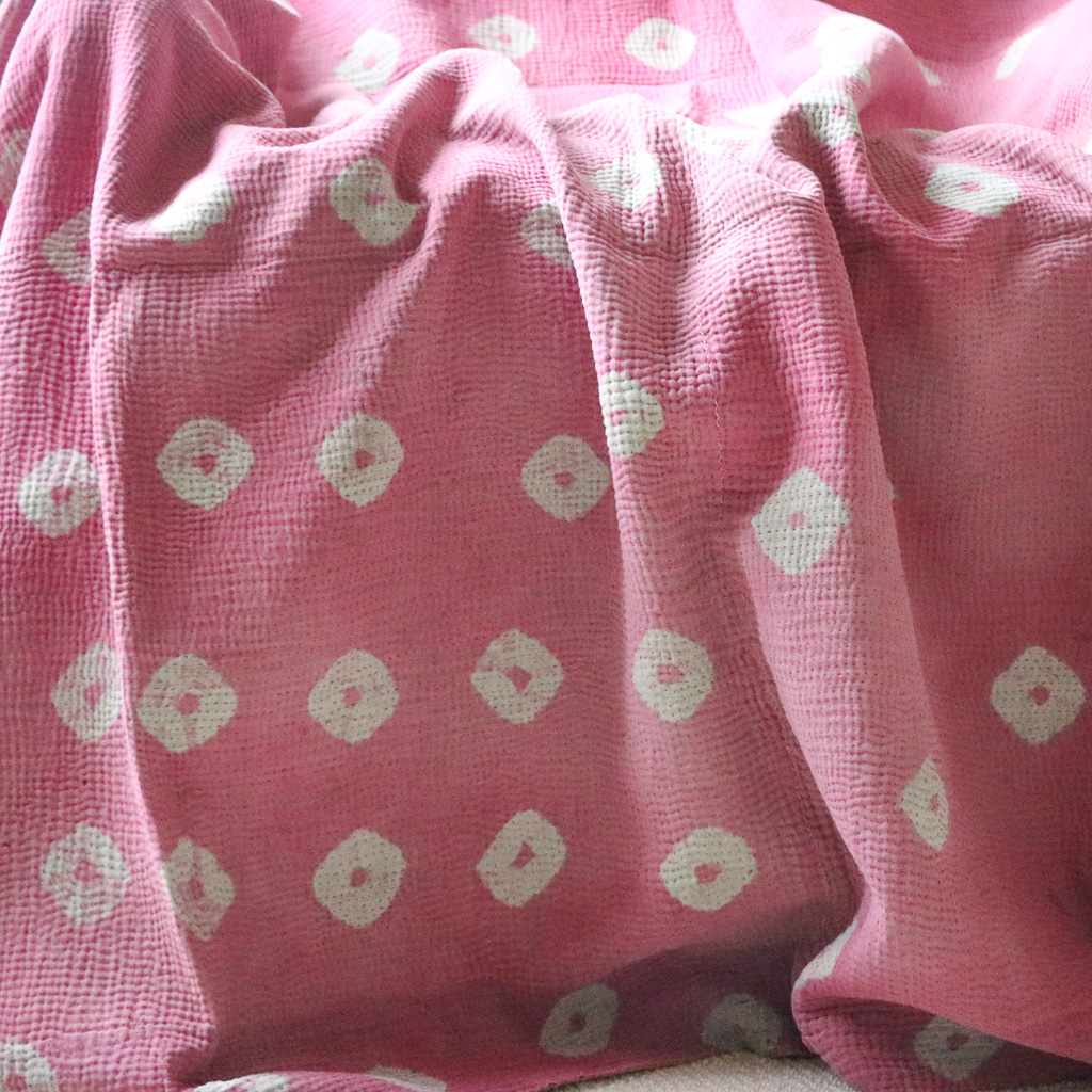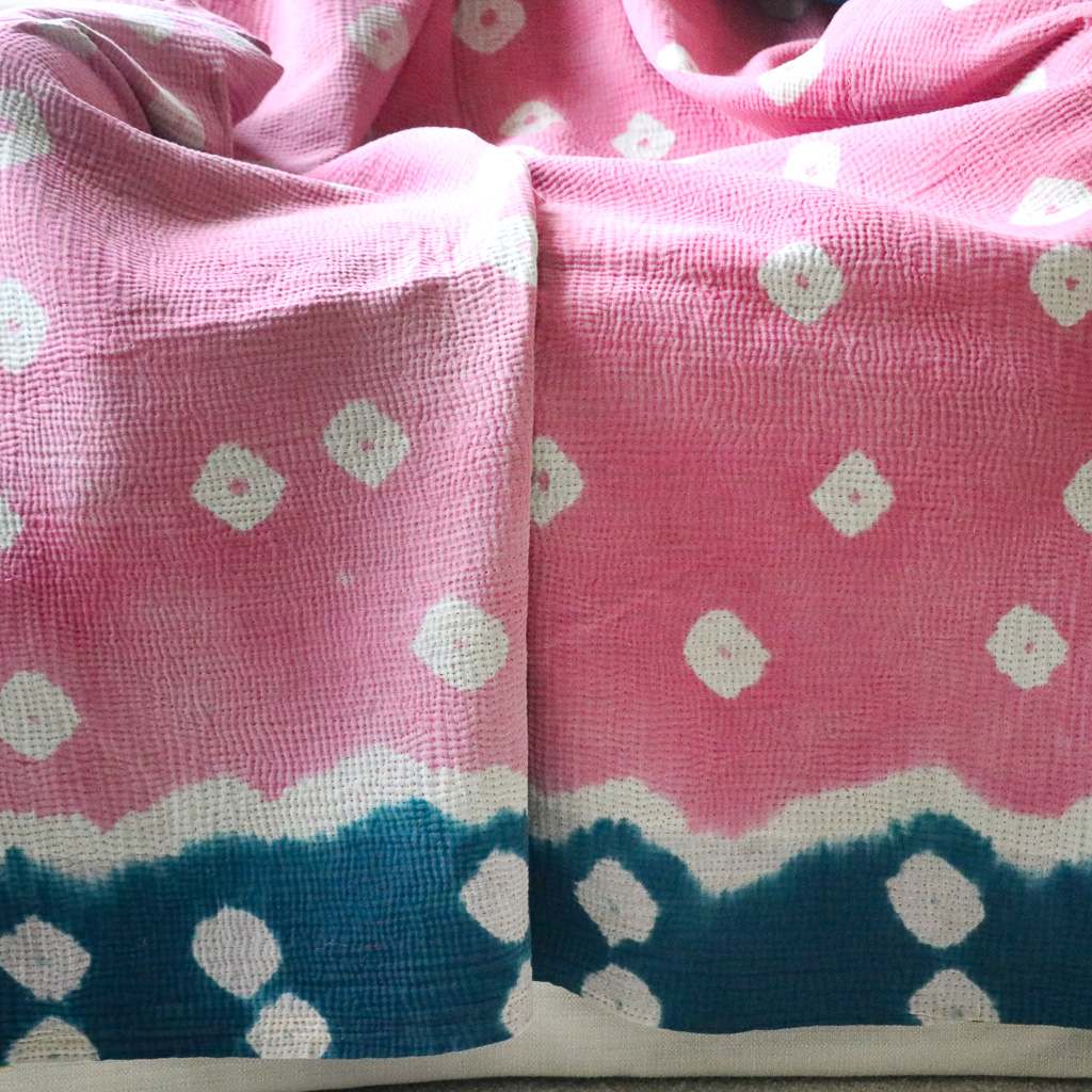 The Lamina Kantha is a wonderful example of Indian block print design in wonderful warm colour of mustard yellow with green accents. The reverse side is a blissfully happy pink with indigo edging in a less common tie-dye design.
