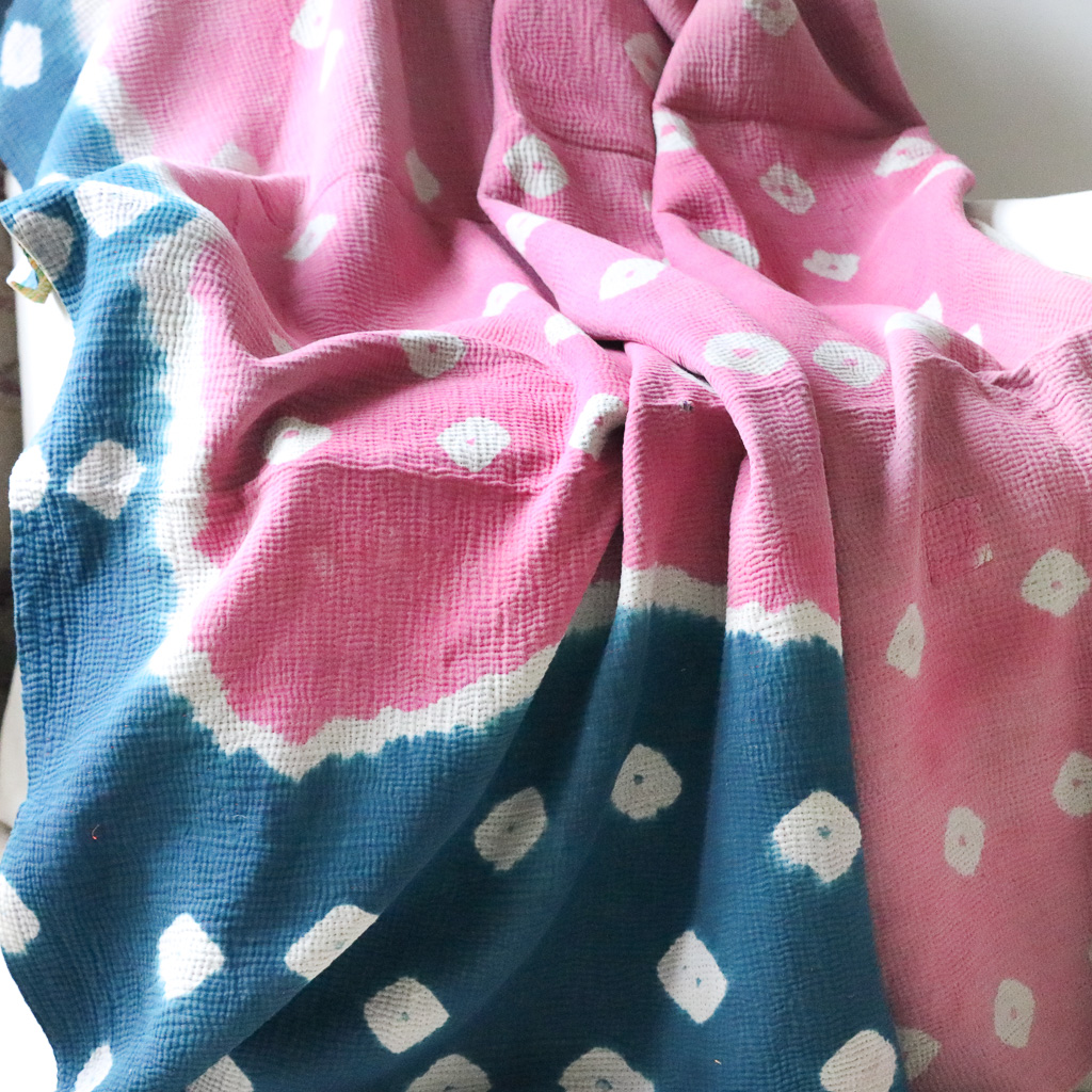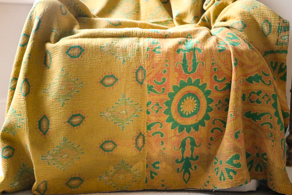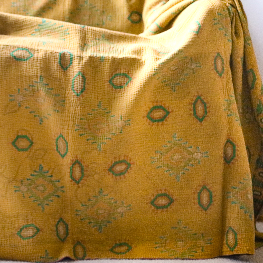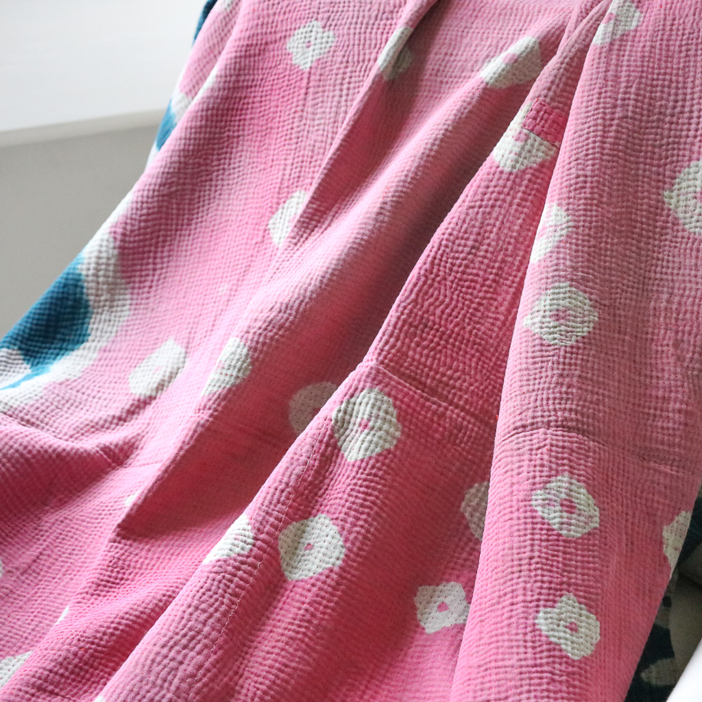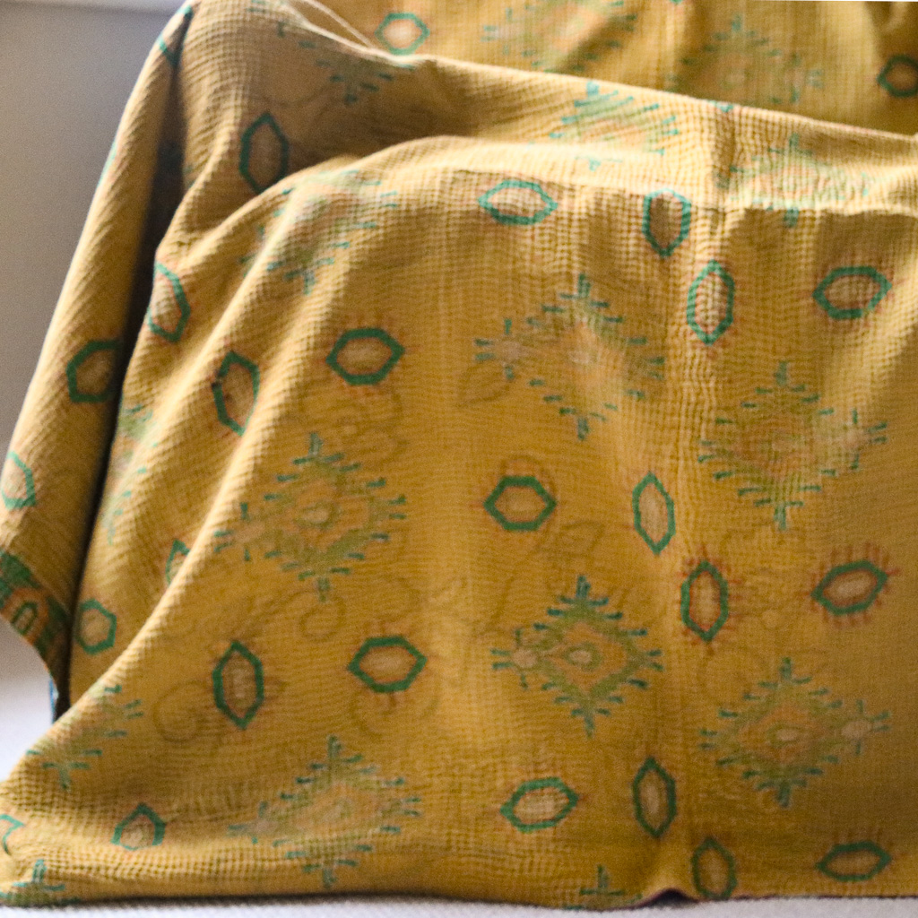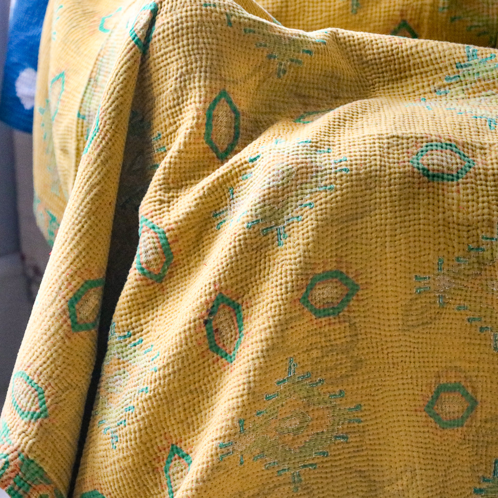 Our kantha are hand block printed (and occasionally hand screen printed) in Indian cotton. Given vintage fabrics are used, small imperfections and signs of wear may be found and are part of the charm.