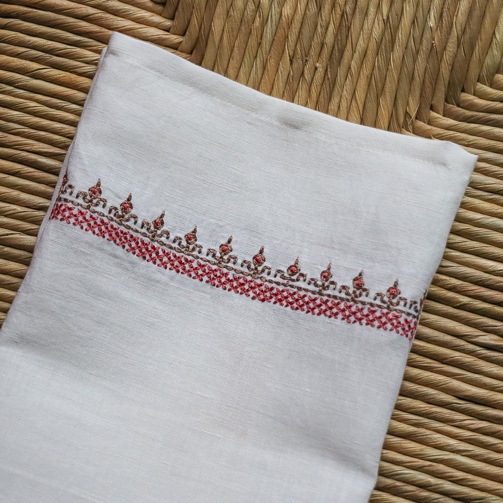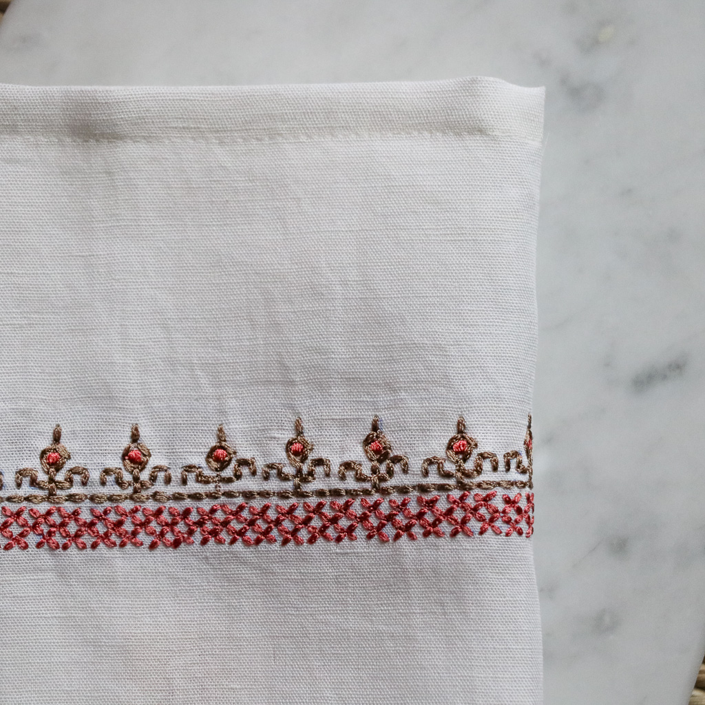 The Lola hand towels introduce beautiful hand embroidery to our range. Featuring a clean white base, intricate (but substantial) stitches in two colours anchor this sweet design. Hearty thanks to our printers for sharing this timeless pattern for our use here.